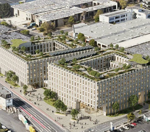 Die TWIN CUBES in Düsseldorf bilden zwei moderne Bürogebäude in recyclingfähiger Konstruktion nach nachhaltigen Kriterien, die eine naturnahe Atmosphäre zur Förderung des gesunden Arbeitens erzeugen sollen.